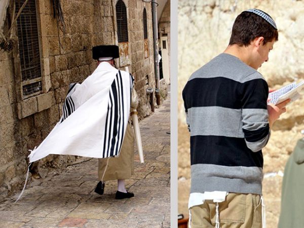 Orthodox Jews today sometimes wear a tallit gadol (large prayer shawl), which is a four-cornered garment with tzitzit on each corner (left). Others wear a tallit katan (small prayer shawl) as an undergarment, also with tzitzit on each corner (right).